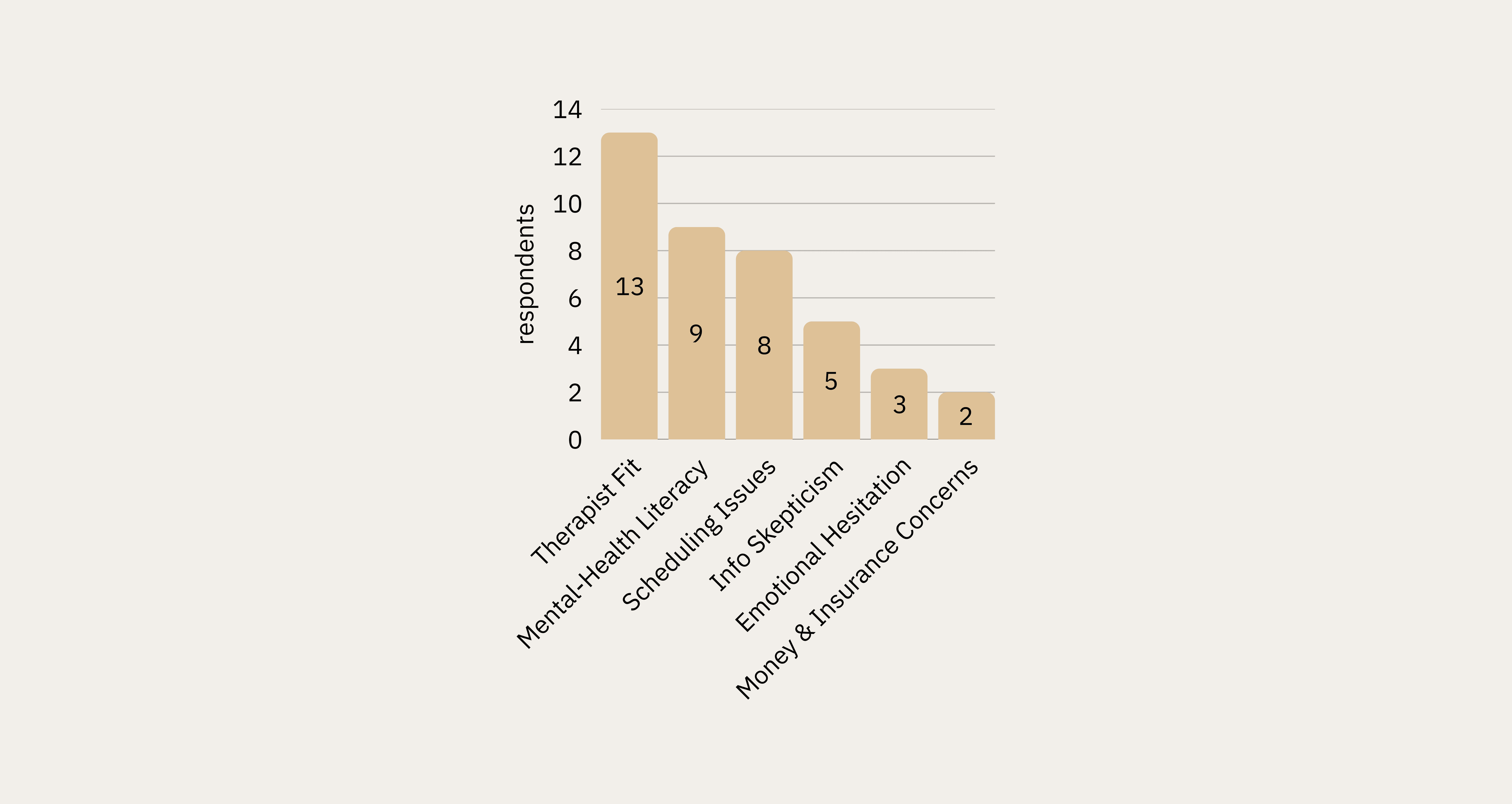 Therapist fit was the most commonly cited barrier to selection (13 respondents), followed by mental health literacy (9) and scheduling issues (8). This triangulated directly with the top themes from interviews.