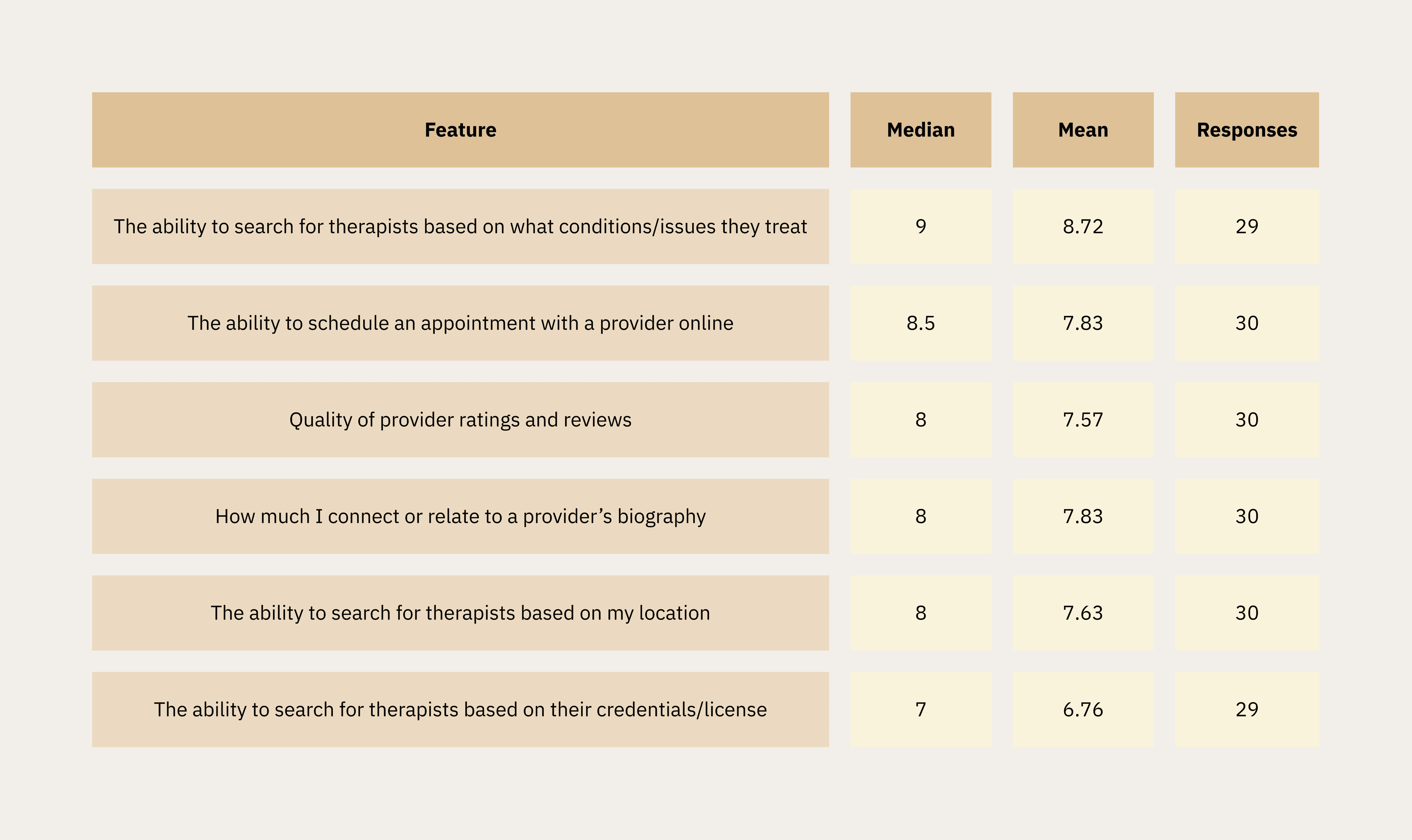 The ability to search by condition/issue was the highest-rated feature (median 9/10). Scheduling online and connecting with a provider’s biography tied at median 8, confirming qualitative themes around scheduling friction and profile depth.