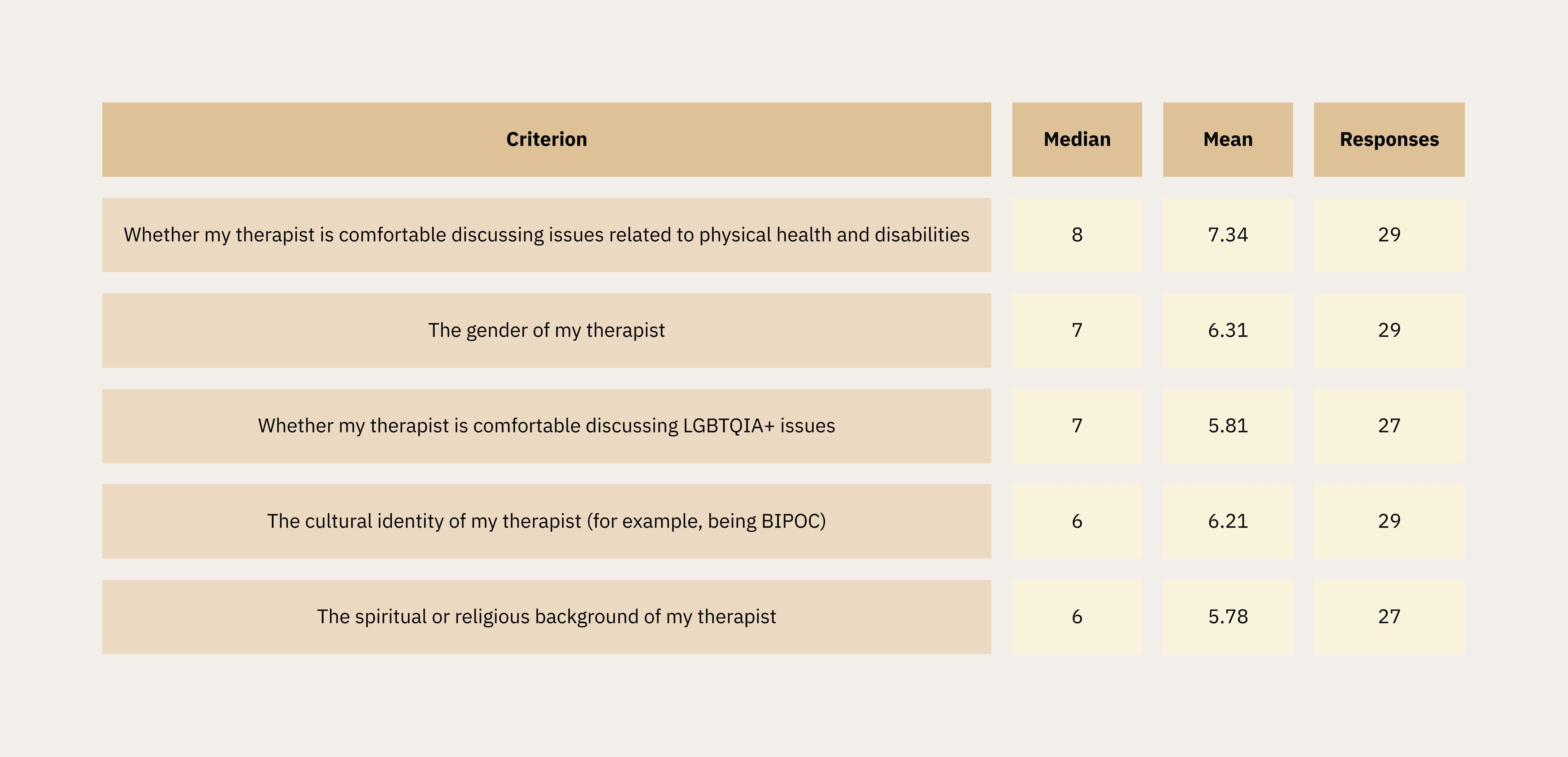 Comfort discussing physical health and disabilities ranked highest among cultural criteria. Comfort discussing LGBTQIA+ issues and cultural identity (BIPOC) were both rated with a median of 6–7, validating the qualitative findings on the importance of cultural fit.