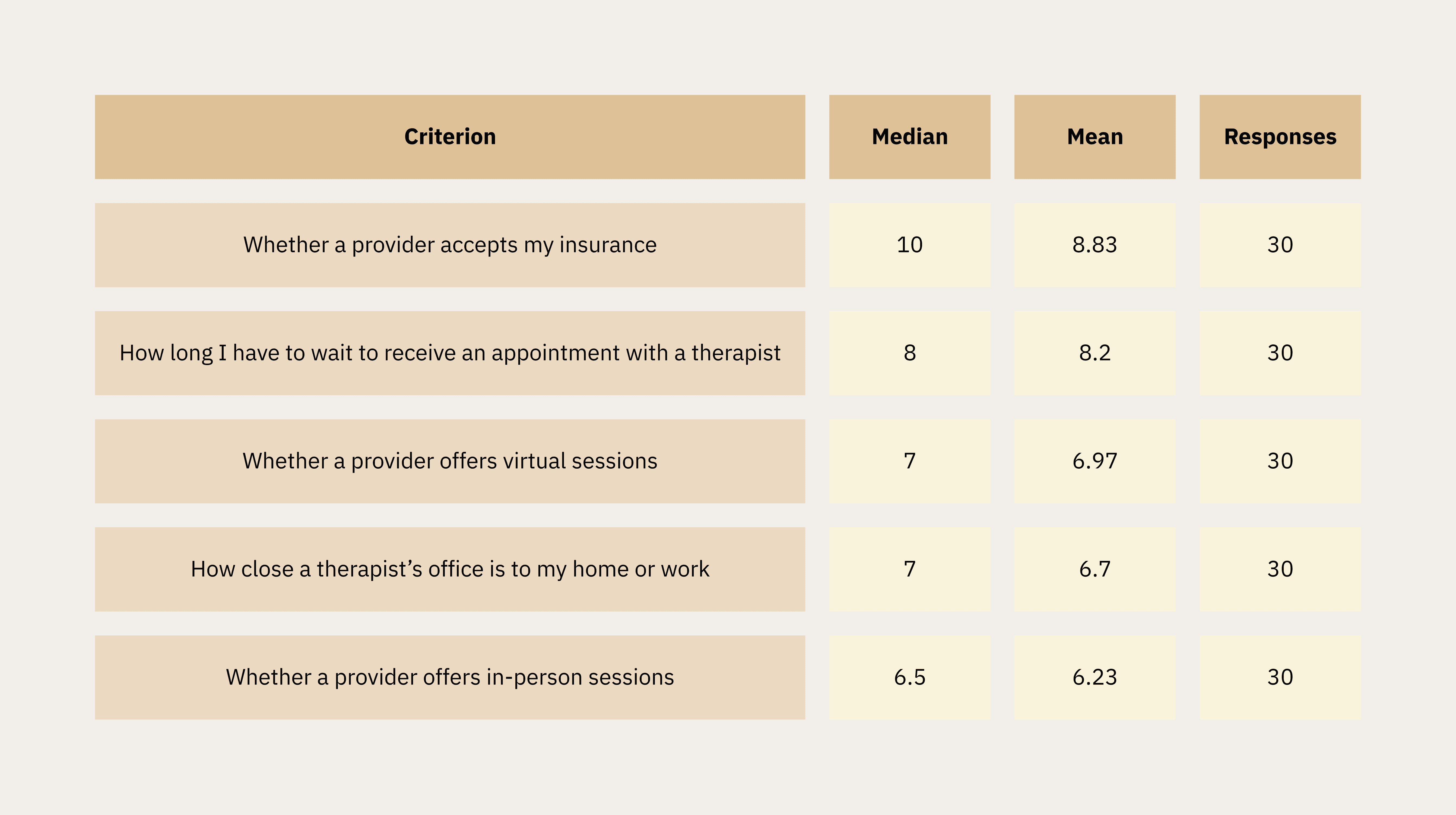 Insurance acceptance was the single highest-rated criterion overall (median 10/10, mean 8.83). Wait time and virtual session availability followed closely.